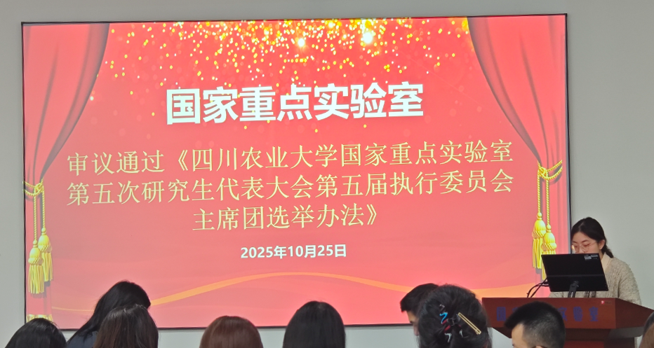 10月25日,四川农业大学国家重点实验室在科技园B108会议室召开了第五次研究生代表大会暨第五届研究生会执行委员会主席团选举大会,第五届研究生会执行委员会审议考核小组成员及60位研究生代表出席会议。会议由第四届研究生会执行委员会主席武娜主持。