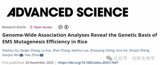11月20日,实验室周浩/吴先军团队在国际著名期刊《Advanced Science》(IF=14.3)发表题为“Genome-Wide Association Analyses Reveal the Genetic Basis of EMS Mutagenesis Efficiency in Rice”的研究成果,该研究首次在全基因组水平系统解析了水稻EMS诱变效率的遗传基础,鉴定出关键基因Rc及其作用机制,为精准设计诱变育种提供了理论依据和实践方案。