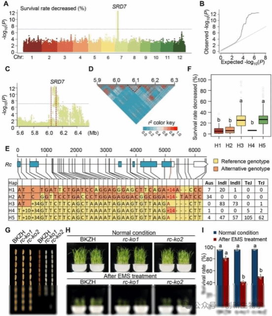 随后团队对 420 份水稻材料的相关性状进行全基因组关联分析,虽未在突变频率性状上鉴定到显著位点,但在耐受性性状上发现了多个显著关联位点。其中 LOC_Os07g11020(即 Rc 基因)成为强候选基因,该基因已知能控制果皮色素沉积和种子休眠,且可促进具有抗氧化活性的原花青素积累,而这些功能均与种子存活率相关。为验证其作用,团队利用 CRISPR/Cas9 技术在红米籼稻品种 BKZH 中创建 Rc 敲除系,经 EMS 处理后,两个敲除系的幼苗存活率均显著低于野生型 BKZH;同时构建以黄华占(HHZ)为背景的 Rc 近等基因系,EMS 处理后 HHZ(Rc)的种子存活率显著高于 HHZ(rc),这两项实验均证实 Rc 基因在增强 EMS 耐受性中起到关键作用。单倍型分析还显示,超过 91% 的 Aus 亚群材料携带功能型 Rc 等位基因,这也和 Aus 水稻优异的 EMS 耐受性和高诱变频率相契合。