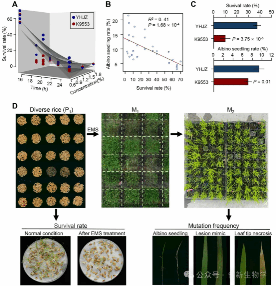 研究团队先系统评估了两个水稻品种在不同 EMS 浓度和处理时间下的诱变效率。结果发现 M₁代植株存活率会随着 EMS 浓度和处理时间的增加而急剧下降,且 M₂代白化苗频率与 M₁代存活率呈负相关;其中籼稻品种 YHJZ 在所有处理条件下,都比粳稻品种 K9553 有着更高的 M₁代存活率和 M₂代白化苗频率,这表明 YHJZ 的 EMS 诱变效率更高。