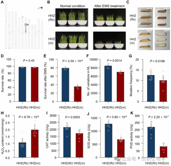 为明确 Rc 是否影响诱变频率,研究者对 M₁代植株进行全基因组测序,发现 HHZ(Rc)的 EMS 诱导突变数量显著高于 HHZ(rc),且 M₂代中 HHZ(Rc)的可见突变体频率也更高,说明功能型 Rc 等位基因还能提高水稻的诱变效率。此外,研究人员探究其作用机制时发现,Rc 种子的胚 NBT 染色较浅,意味着胚细胞活力更高,同时 rc 种子积累的 H₂O₂和其他 ROS 水平显著高于 Rc 种子,而 Rc 种子中的 CAT、SOD 和 POD 等抗氧化酶活性显著更高,由此得出 Rc 是通过提升抗氧化能力减轻 EMS 诱导的氧化损伤,进而增强 EMS 耐受性和诱变效率的结论。