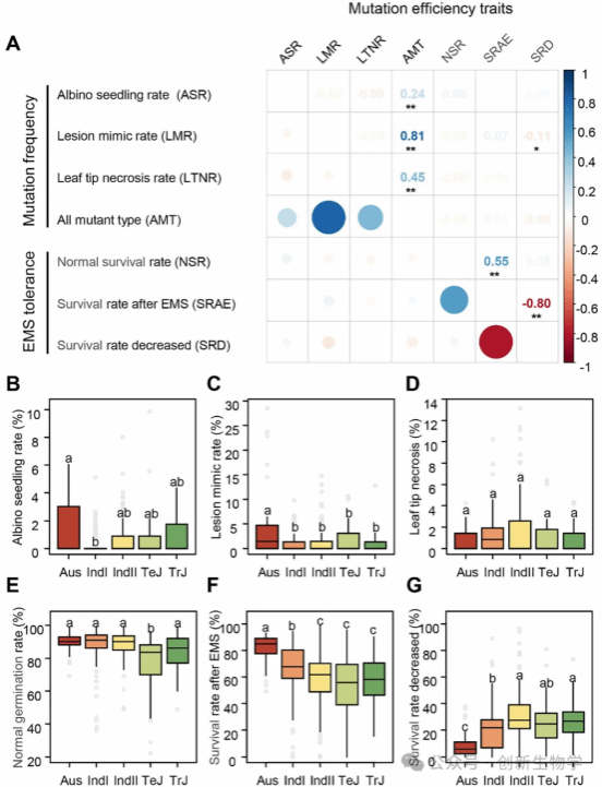 为深入解析遗传基础,团队对包含 420 份多样化水稻种质资源的群体展开分析,量化了 EMS 耐受性和突变频率这两个关键性状,前者以 EMS 处理前后存活率的降低程度衡量,后者以 M₂代幼苗中出现白化、类病斑等突变表型的比例衡量。在 0.6% EMS 处理 20 小时的条件下,研究发现 Aus 亚群在突变频率和耐受性相关性状上均显著优于 IndI、TeJ 等其他亚群,且通过对五个水稻亚群的 M₁代幼苗进行全基因组测序,证实 Aus 亚群中 EMS 诱导的全基因组 SNP 数量也显著高于其他亚群,由此确定 Aus 亚群在该水稻群体中具有最高的 EMS 诱变效率。