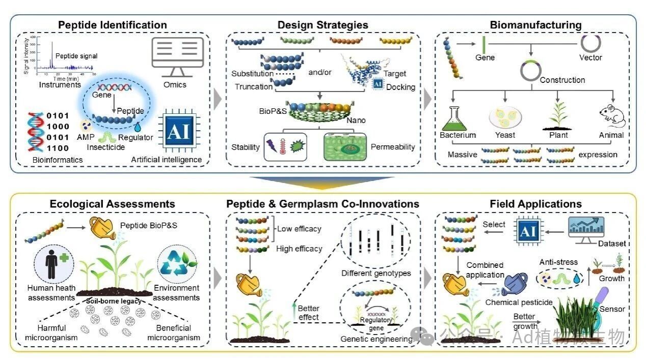 植物源小肽因其多效性、高效性、可生物降解以及对生态环境低风险等显著优势,被视为替代传统化学农药的理想选择。然而,其从实验室走向田间仍面临两大关键挑战:其一,从活性小肽的挖掘、作用机制解析、分子结构优化到生态安全性评估及最终田间验证,整个流程周期长、投入大,亟需构建一套高效、系统且具有自主知识产权的小肽精准发现体系;其二,农业投入品必须满足产业经济性要求,这就需要针对特定小肽序列,优化底盘细胞、开发高表达系统,并建立符合法规标准的生产工艺与纯化流程,从而搭建起完整的生物制造平台。目前,小肽在底盘细胞中的高产表达机制尚不清晰,大规模系统性鉴定植物功能小肽并实现其在多种底盘中的高效适配,仍是技术突破的核心方向。未来,随着人工智能驱动的理性设计、纳米材料赋能的精准递送以及合成生物学支撑的高效制造等技术深度融合,植物小肽的研发与应用有望迈入新阶段。通过多学科交叉协同与政策引导,构建兼顾经济效益与生态可持续性的推广模式,将有力推动作物安全生产与生态环境保护的协同发展。