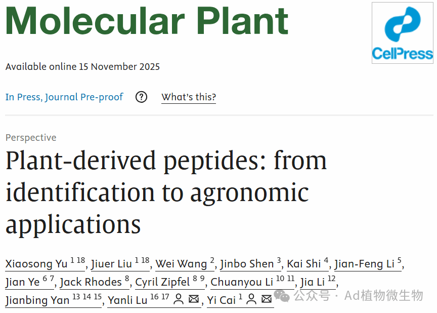近日,实验室卢艳丽教授与生命科学学院蔡易教授领衔的研究团队,联合中国科学院、浙江大学、中山大学、英国东英吉利大学、瑞士苏黎世大学等十余家国内外知名高校与科研机构,在植物学领域权威期刊《Molecular Plant》(五年影响因子25.8)上发表了题为《Plant-derived peptides: from identification to agronomic applications》的前瞻性综述论文。该文入选极具学术稀缺性与引领力的Perspective栏目,系统提出了一个贯通“植物小肽鉴定—分子设计—生物制造—生态评估—药种协同创新—田间应用”的全链条创新体系,并融合人工智能、纳米技术与合成生物学等前沿科技,为解决小肽在规模化生产中成本高昂、田间稳定性差等产业化瓶颈问题,提供了兼具科学深度与实践可行性的整体解决方案。