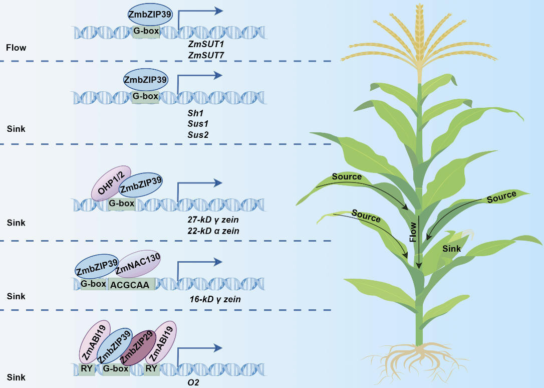 RNA-seq分析表明ZmbZIP39突变影响激素合成、细胞周期、糖转运以及淀粉合成等多个重要生物学过程。ChIP-seq分析发现ZmbZIP39不仅通过调控蔗糖转运蛋白ZmSUT1和ZmSUT7促进蔗糖从叶片高效率转运至籽粒,还直接调控蔗糖合酶促进蔗糖分解。此外,ZmbZIP39可直接结合到醇溶蛋白合成基因以及胚乳灌浆核心调控因子Opaque2启动子促进胚乳灌浆和储藏物质合成。另外,ZmbZIP39与胚乳灌浆调控关键因子ZmABI19、ZmbZIP29、OHP1、OHP2及ZmNAC130互作,实现储藏物质合成的最大化。