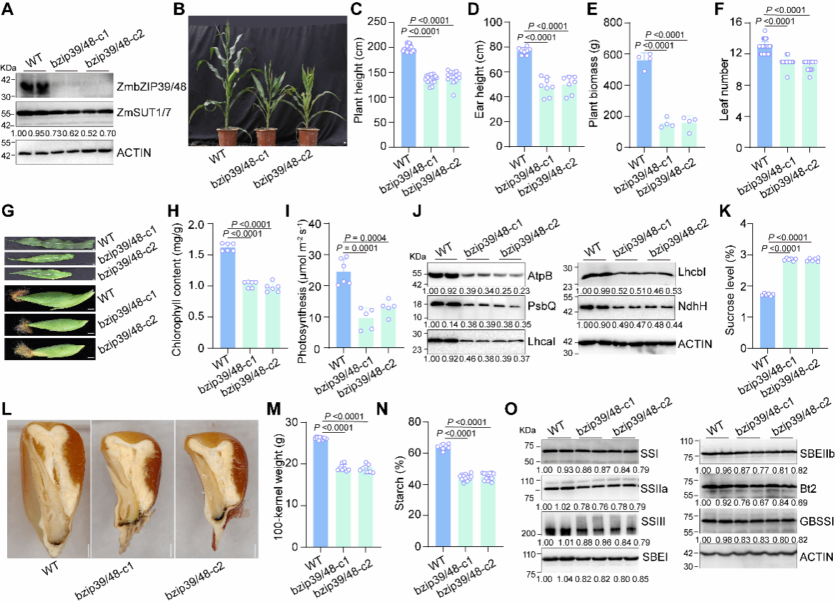 研究团队首先采用不同长度的ZmSUT1启动子开展转录活性测试,发现起始密码子上游500-1000bp为重要调控区域。进一步采用DNA-protein pull-down联合质谱分析,鉴定到ZmbZIP39为ZmSUT1上游调控因子,并利用多种实验证实ZmbZIP39通过结合到ZmSUT1启动子上的G-box元件发挥调控功能。鉴于ZmbZIP39与ZmbZIP48序列高度同源,研究团队构建了zmbzip39和zmbzip48双突变体。结果显示,发现纯合突变体表现为植株矮化、叶片黄化、光合效率降低、籽粒变小、糖和蛋白储藏量均显著降低。相反,ZmbZIP39过表达植株的光合效率增强、生物量增加、衰老延迟、籽粒变大且糖储存量增加。
