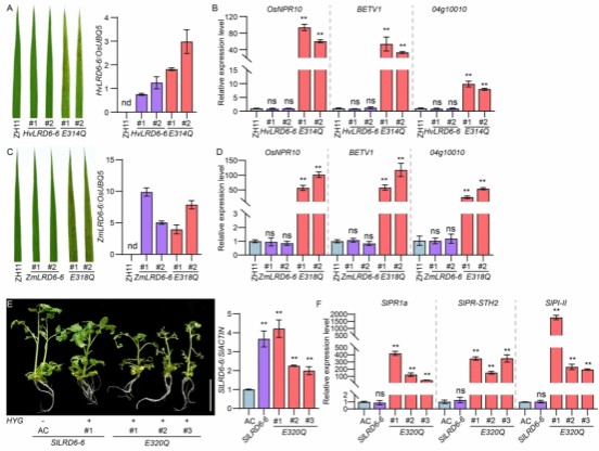 为探究该策略的广泛应用价值,研究团队对大麦、玉米、番茄等作物中的LRD6-6同源蛋白进行分析,发现其Walker B基序中与水稻E315对应的谷氨酸残基在不同物种中高度保守。体外实验证实,这些作物中该位点的EQ突变体均表现出显著降低的ATP酶活性,且能与野生型蛋白互作产生显性负效应。异源表达实验显示,大麦、玉米的LRD6-6 EQ突变体能在水稻中诱导自身免疫,番茄的EQ突变体也能在番茄中激活免疫反应(图4)。进一步对藻类、草本植物、花卉、蔬菜、果树等28种不同植物的LRD6-6同源蛋白分析发现,该保守谷氨酸残基广泛存在,表明病原菌诱导型显性负效突变体表达策略具有跨物种的应用潜力,可推广至多种作物的抗病育种中。