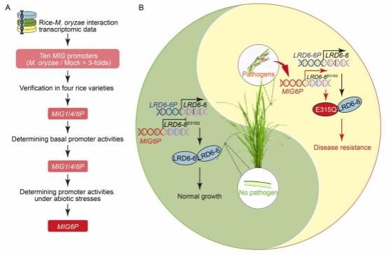 基于此,研究团队提出核心策略:利用病原菌诱导型启动子驱动LRD6-6E315Q表达,使其仅在病原菌侵染时激活表达以启动抗病反应,正常生长条件下则不表达或仅保持较低表达,避免对生长和产量造成负面影响。为筛选符合要求的理想启动子,团队分析了水稻与稻瘟病菌互作早期的转录组数据,从抗病和感病品种中均被诱导的基因中筛选出10个候选启动子,并通过多品种、多时间点验证,发现MIG1P、MIG4P、MIG6P三个启动子在稻瘟病菌侵染早期能快速被激活。