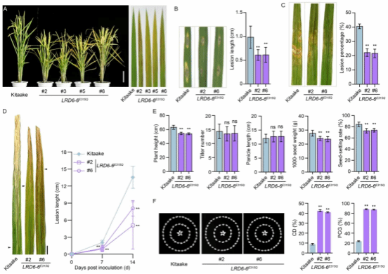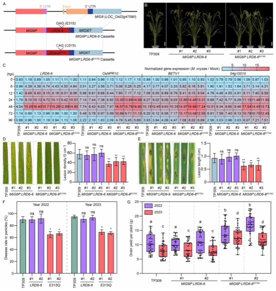 研究团队构建了MIG6P:LRD6-6E315Q基因表达载体,将其转化至水稻品种TP309中,获得的转基因水稻在正常生长条件下,株型、垩白度等农艺性状与野生型无显著差异,保持了正常的生长发育和产量潜力。而当受到病原菌侵染时,MIG6P被快速激活,驱动LRD6-6E315Q高效表达,通过显性负效应抑制野生型LRD6-6的功能,激活水稻免疫反应,显著增强了水稻对稻瘟病、白叶枯病、纹枯病的抗性(图3)。在自然发病的稻瘟病圃中,MIG6P:LRD6-6E315Q水稻的穗颈瘟发病率显著降低,且连续两年的籽粒产量均显著高于对照,成功实现了抗病性提升与产量稳定的协同,打破了生长/产量-抗病性的权衡效应(图3)。