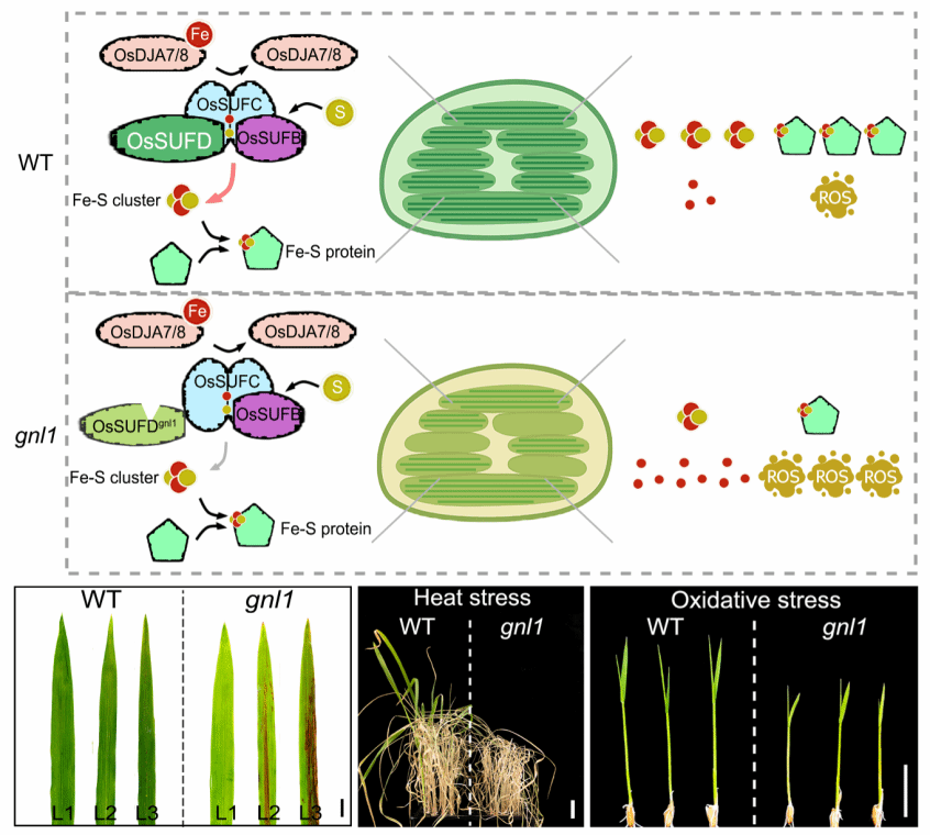 Fe–S clusters是生物体内多种生命活动不可或缺的辅助因子,广泛参与呼吸作用、光合作用、DNA修复等关键生理过程,其功能异常会直接影响生物体正常生长发育。在植物叶绿体中,铁硫簇的生物合成主要由进化上高度保守的SUF途径介导,该途径在维持叶绿体功能稳态中发挥着核心作用。然而,目前关于水稻SUF系统的分子组成,及其在叶绿体生物学功能调控和环境胁迫适应中的具体作用仍不清楚,制约了相关领域的研究与应用推进。