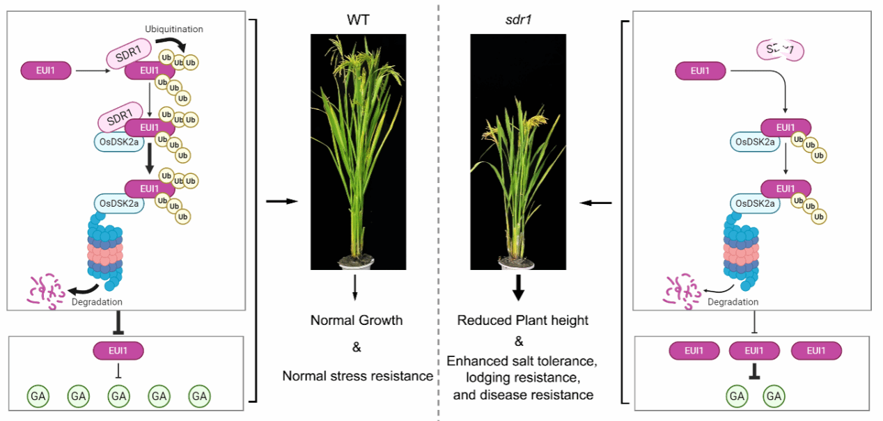 本研究利用化学诱变结合MutMap技术,在高产、高配籼稻恢复系600R(sd1背景)中鉴定了一个新的半矮秆基因SDR1(SEMI-DWARF RICE 1)。该基因编码一个具有活性的RING-H2 型 E3 泛素连接酶,且在水稻茎节间组织中特异性高表达。分子机制研究显示,SDR1可通过互作直接靶向GA失活关键酶EUI1,并介导其基于泛素-蛋白酶体途径的降解,进而通过精细调控水稻体内GA稳态,实现对株高的控制。研究同时发现,SDR1可与类泛素-泛素结合结构域蛋白(UBL-UBA) OsDSK2a形成复合物,二者协同作用,促进EUI1的蛋白酶体降解过程,研究因此构建了三者的分子调控网络。